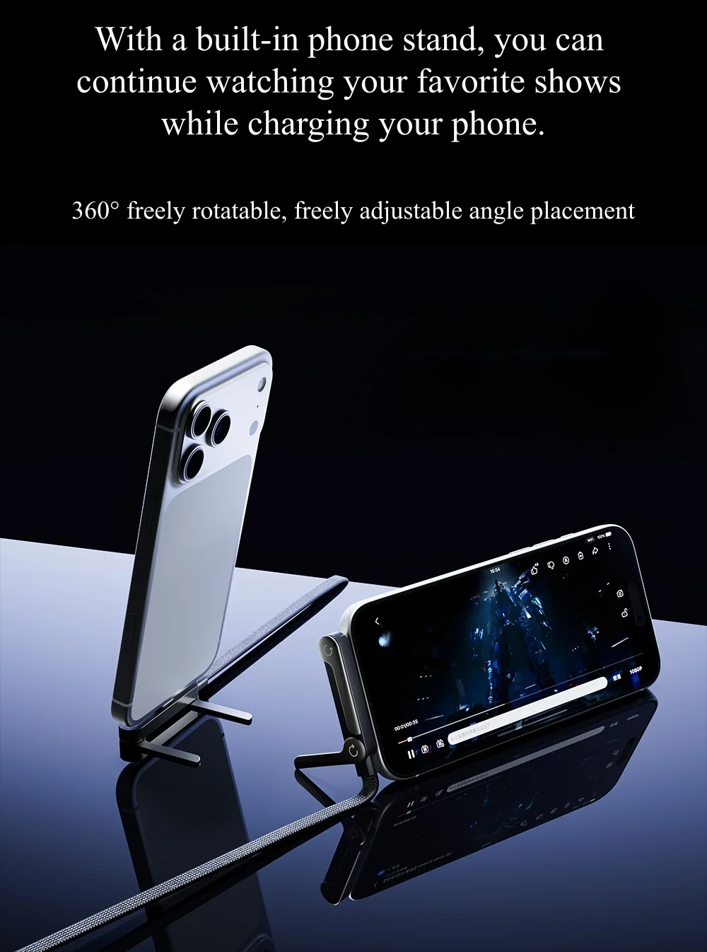 This 2-IN-1 Type-C cable features a foldable mobile phone holder, combining charging and support functions for convenience.