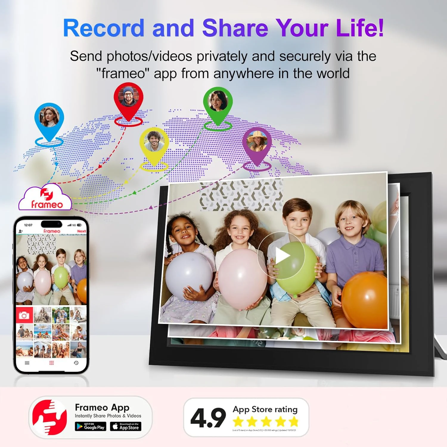 1.Share Photos And Video Privately,Safely:With the "Frameo app" (available for download from Google Play and App Store), you can quickly and easily share your good time with your loved ones. Send photos or small videos (max. 15 seconds) directly to FRAMEO APP from anywhere in the world,