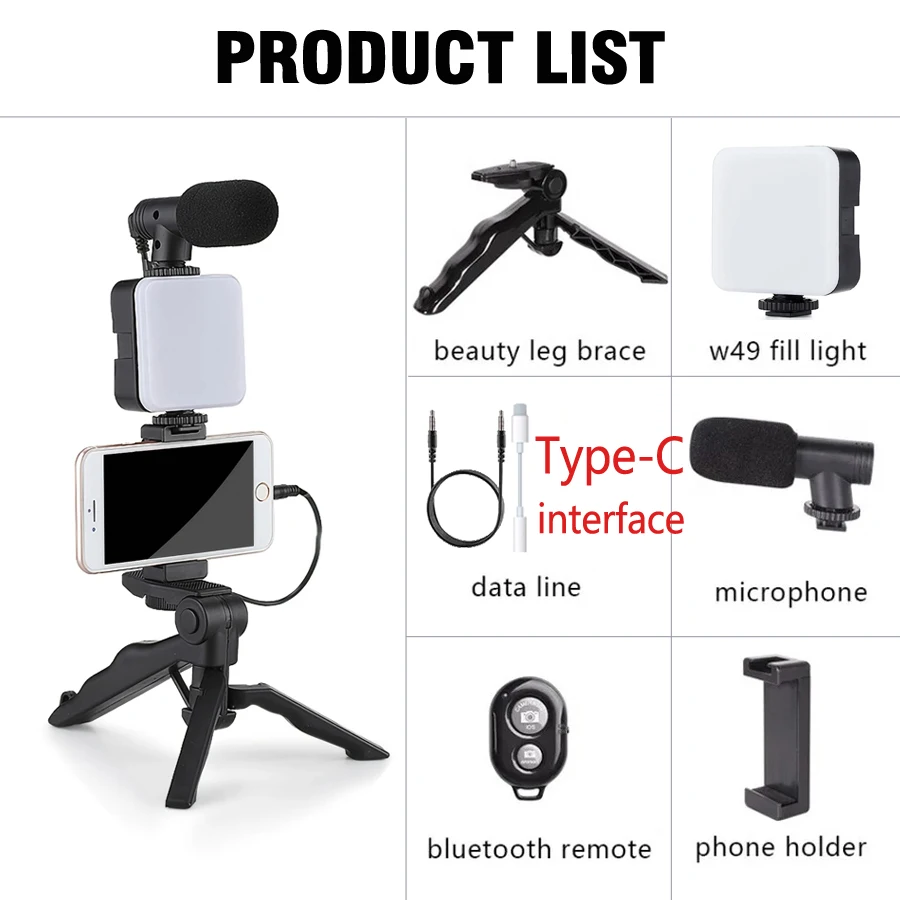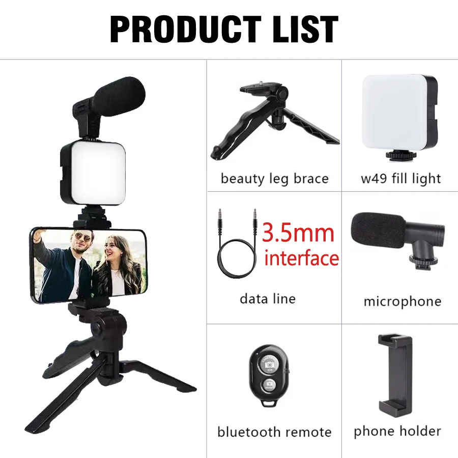 Smartphone Vlogging Kit With Tripod Phone Holder Mini Microphone LED Fill Light Starter For TikTok Live Stream Video YouTubeSmartphone Vlogging Kit With Tripod Phone Holder Mini Microphone LED Fill Light Starter For TikTok Live Stream Video YouTube