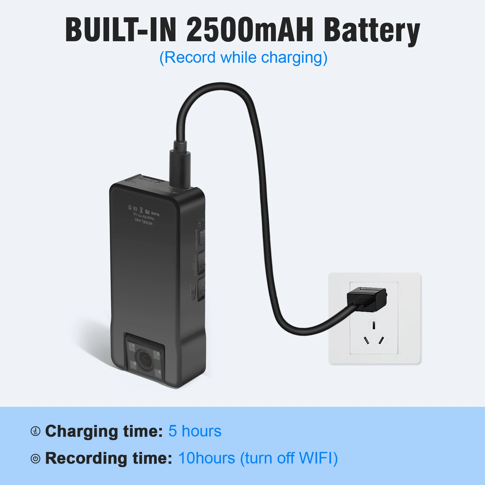 3000mAh battery, the large capacity battery lasts about 9 hours of recording while connected to wifi.